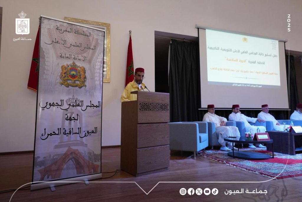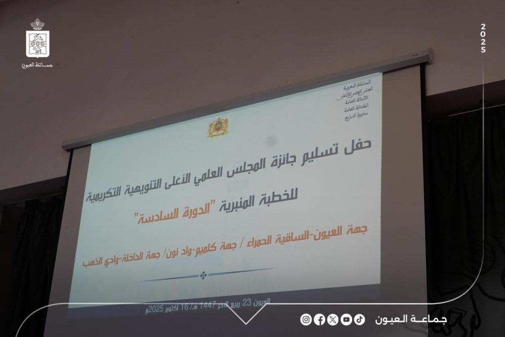 نظَّم المجلس العلمي الأعلى صباح يوم الخميس 16 أكتوبر 2025، بمكتبة محمد السادس الوسائطية الكبرى، حفلاً مميزًا لتتويج الخطباء الفائزين بجائزة المجلس العلمي الأعلى للخطبة التنويهية التكريمية المنبرية في دورتها السادسة برسم سنة 1447 هـ، وذلك على صعيد المجالس العلمية المحلية بالجهات الجنوبية الثلاث: جهة العيون الساقية الحمراء، وجهة كلميم واد نون، وجهة الداخلة وادي الذهب.