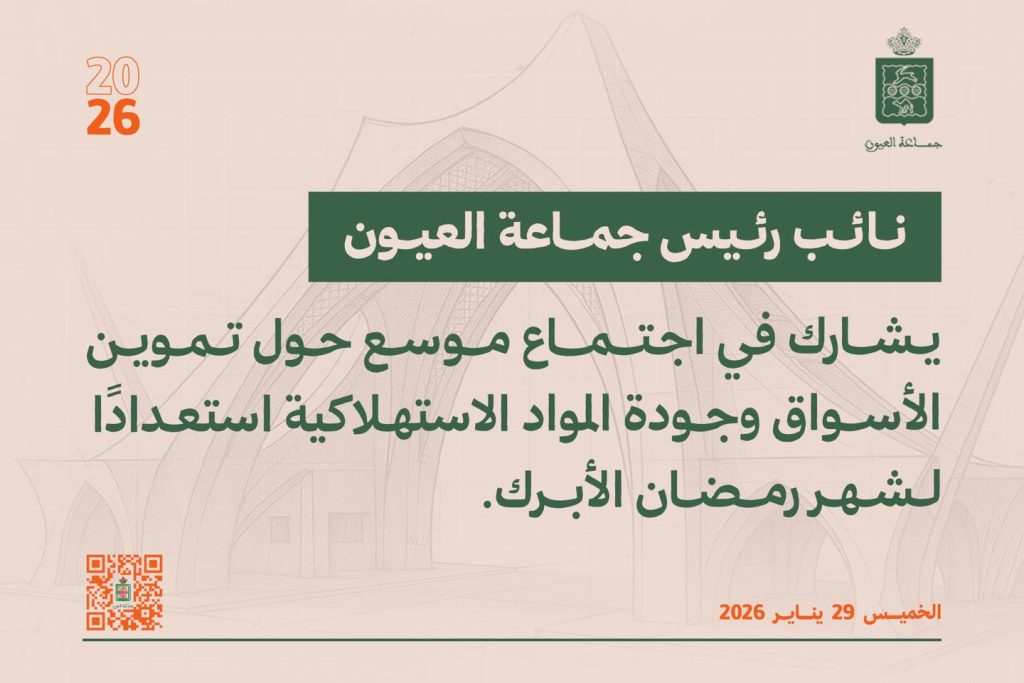 ترأس السيد أحمد الفغلومي، الكاتب العام لولاية جهة العيون الساقية الحمراء، صباح اليوم الخميس 29 يناير 2026 بمقر الولاية، اجتماعًا تنسيقيًا موسعًا بحضور السيد إعبيد امريزيك نائب رئيس جماعة العيون، وأطر الجماعة، وممثلي المصالح الخارجية، والمكتب الوطني للسلامة الصحية للمنتجات الغذائية ONSSA، إلى جانب ممثلي الهيئات والمؤسسات المعنية، وذلك في إطار الاستعدادات لاستقبال شهر رمضان المبارك.