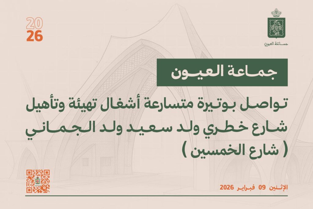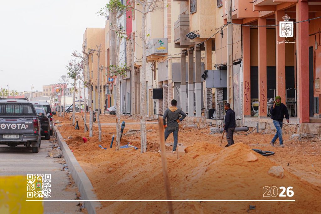 تواصل جماعة العيون، بوتيرة متسارعة ومنتظمة، أشغال تهيئة وتأهيل شارع خطري ولد سعيد ولد الجماني، المعروف محليًا بـ“شارع الخمسين”، في إطار برنامجها الشامل لتأهيل البنية التحتية الحضرية وتحسين جودة الفضاءات العمومية بالمدينة.