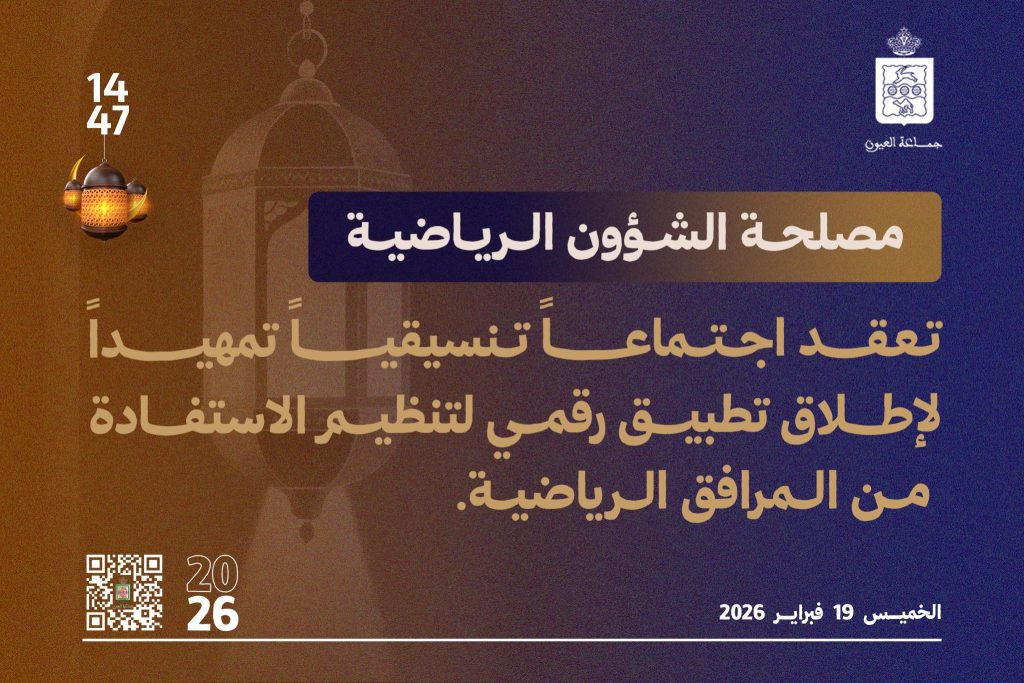 تنفيذاً لتعليمات السيد رئيس جماعة العيون، وفي خطوة تروم تعزيز التحول الرقمي وتقريب الخدمات من المواطن، عقدت مصلحة الشؤون الثقافية والاجتماعية والرياضية بالجماعة اجتماعاً تنسيقياً تمهيدياً خُصص لتدارس مشروع إطلاق تطبيق رقمي مستقبلي يهدف إلى تسهيل عملية تسجيل الراغبين في الاستفادة من الحصص الرياضية بمختلف المرافق التابعة للجماعة، سواء تعلق الأمر بالأطفال أو الرجال أو النساء أو الفرق الرياضية، وذلك في إطار تنظيم أفضل للاستفادة المجانية من هذه الفضاءات.