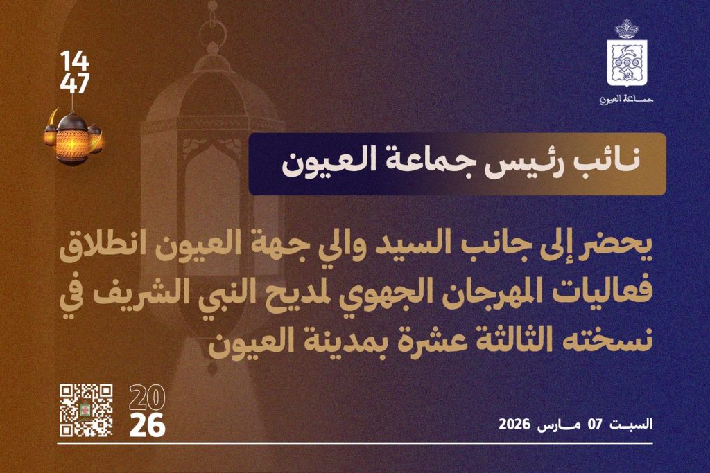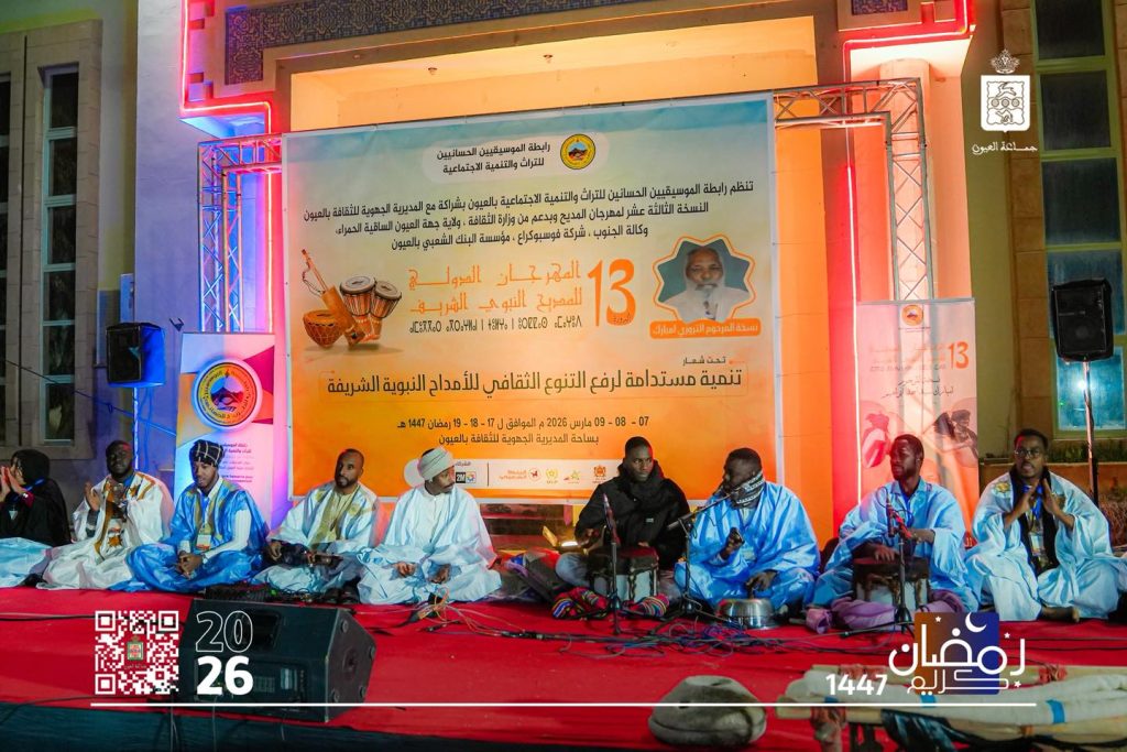 احتضنت ساحة المديرية الجهوية للثقافة بمدينة العيون، مساء اليوم السبت 07 مارس 2026، فعاليات افتتاح النسخة الثالثة عشرة من المهرجان الجهوي لمديح النبي الشريف، الذي تنظمه رابطة الموسيقيين الحسانيين للتراث والتنمية الاجتماعية، بشراكة مع وزارة الثقافة والشباب والتواصل وبدعم من عدد من الشركاء المؤسساتيين. ويأتي تنظيم هذا الحدث الثقافي والديني في إطار تثمين التراث الحساني وتعزيز حضور فن المديح النبوي كرافد من روافد الهوية الثقافية بالمنطقة.