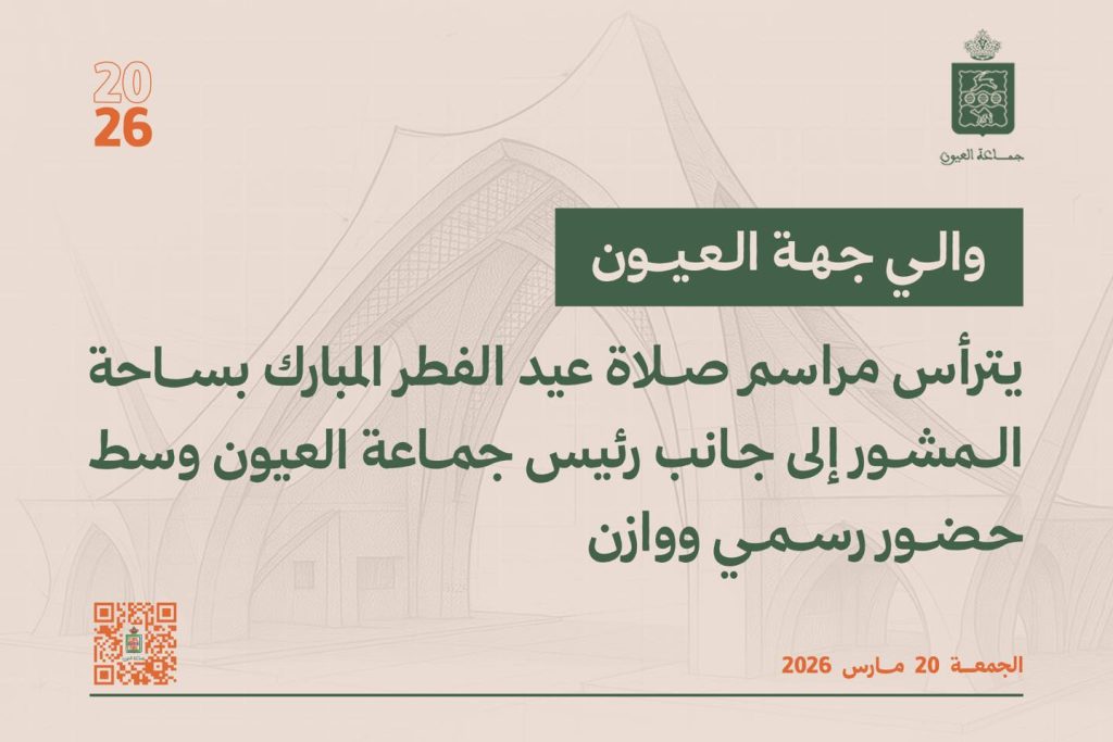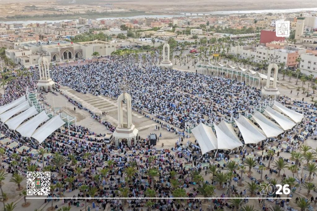 شهدت مدينة العيون، صباح اليوم الجمعة 20 مارس 2026، إقامة صلاة عيد الفطر المبارك بساحة المشور، وسط أجواء روحانية مفعمة بالخشوع والسكينة، وبمشاركة حاشدة لآلاف المصلين الذين توافدوا من مختلف أحياء المدينة لأداء هذه الشعيرة الدينية في أجواء طبعتها الطمأنينة والتنظيم المحكم.